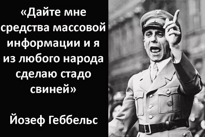 Шок и ложь — вот два кита, на которых стоит совершенная пропаганда. Если людей подводить к той или иной мысли постепенно, не торопясь, должного результата не будет. Если солгать по мелочи — тоже. Поэтому информация должна огорошивать, ведь только шокирующие послания маниакально передаются из уст в уста. Адекватные сведения проходят незамеченными.