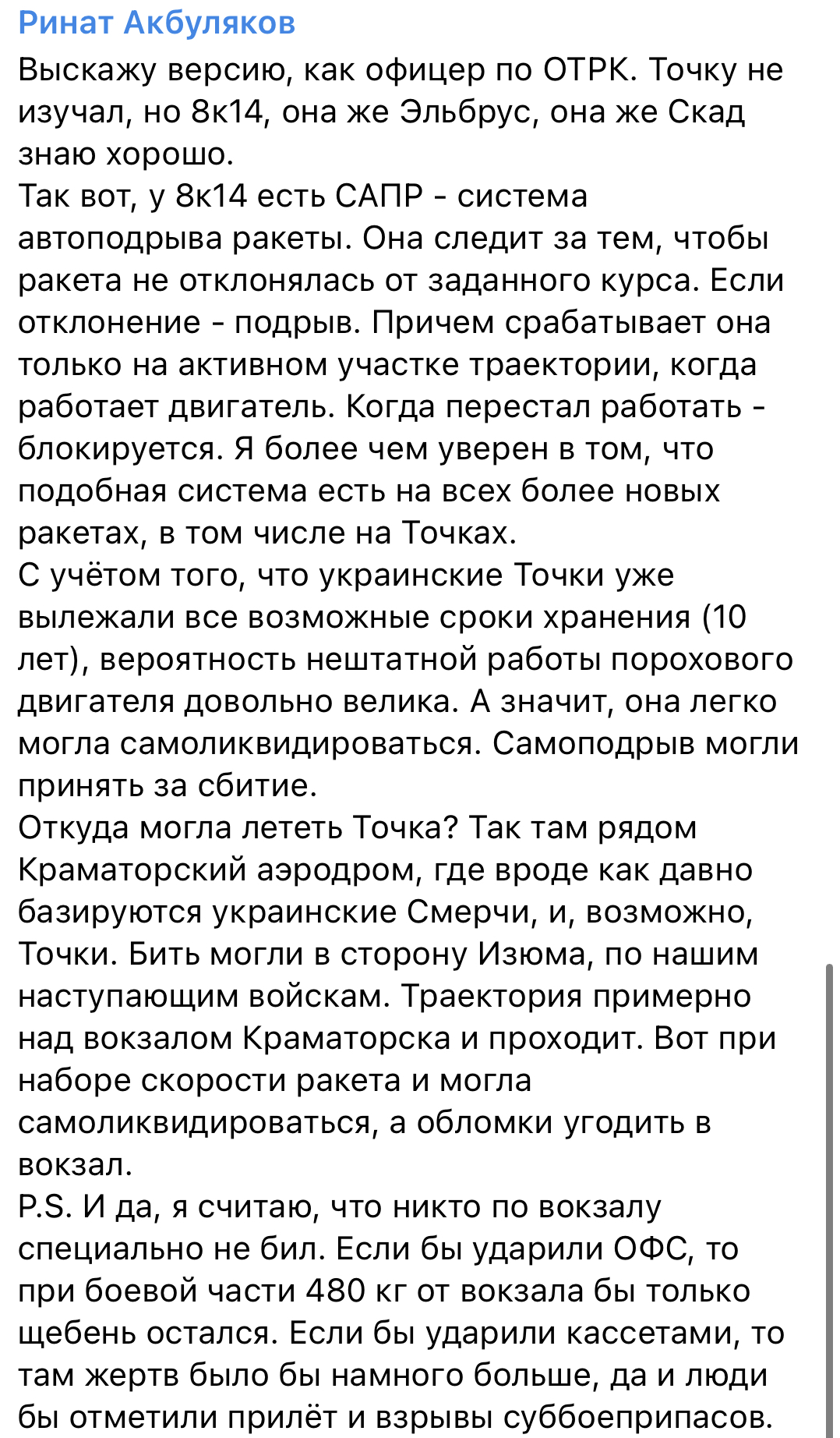 По сообщениям украинской стороны, возможное число погибших – более 30 человек, свыше 100 раненных. Владимир Зеленский объявил, что удар по вокзалу в Краматорске был нанесен российской "Точкой-У". Позднее глава так называемой Донецкой областной военной администрации Павел Кириленко исправил оплошность Зеленского, заявив, что удар был нанесен ракетным комплексом "Искандер", который действительно стоит на вооружении российской армии.