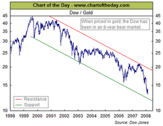 Очевидно, значение Dow снижается по отношению к золоту и нефти, и растёт только из-за обесценивания доллара.