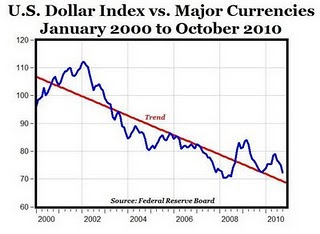 Когда всё рвануло, это повлекло за собой обвал цен и дефолты, необходимость распутывать всю схему использования больших долей заёмных средств, и паническую распродажу активов для перекрытия огромного кризиса ликвидности, деноминированного в долларах. Из-за этого доллар резко поднялся в стоимости, поскольку необходимость в долларах выросла, и наоборот, при росте стоимости доллара, золото и нефть, оцененные в долларах, начали падать в стоимости. Как только Федеральная резервная система и казначейство утихомирили кризис ликвидности, цены вернулись к своему естественному состоянию, и взяли курс на нынешний как бы бычий рынок. Финансовый кризис был лишь небольшим препятствием в долгосрочном обесценивании доллара. Очень интересно наблюдать, как накануне кризиса золото и нефть находились на рекордных пиках, а доллар был на рекордных минимумах; финансовый кризис в действительности продлил доллару жизнь.