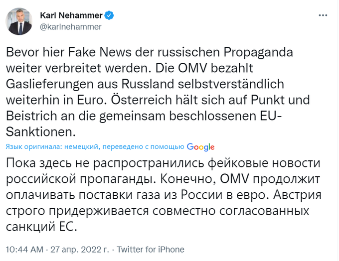 ‼️ Австрия и австрийская OMV приняли условия оплаты российского газа в рублях, — СМИ со ссылкой на канцлера Австрии.