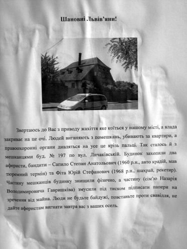 Обращаюсь к вам в связи с ужасом, который творится в нашем городе, а власть закрывает на это глаза. Людей выбрасывают из жилищ, а правоохранные органы смотрят на всё это сквозь пальцы. Так случилось и с жильцами дома №197 по улице Лычаковской. Дом захватили два бандита – Степило Степан Анатольевич( 1960 г.рождения, автоугонщик, сидел в тюрьме)и Фита Юрий Стефанович( !968 г.рождения, жулик, рэкетир). Часть жителей дома уничтожили физически, а часть( семью Назария Владимировича Гавришкина) заставили силой подписать бумаги об отречении от имущества. Люди, не будьте равнодушными, встаньте против беспредела, не дайте аферистам выбрасывать нас из наших жилищ»