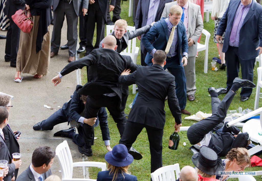 Фотки понадергали с миру по нитке что-ли? Нижняя явно Британия. Это у них принято стоять и пить пиво под непринужденую беседу, даже если рядом в 5ти метрах стулья и столы, все равно будут стоять, лица, выправка людей, стиль одежды тоже бритские. Кстати, подраться они тоже не дураки.