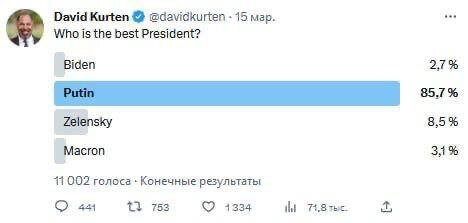 В Великобритании один из партийных лидеров английского парламента решил в своём Твиттере провести опрос: "Кто лучший президент?". За сутки (на 16 марта) проголосовало 11 000 человек и выглядело это как-то так: