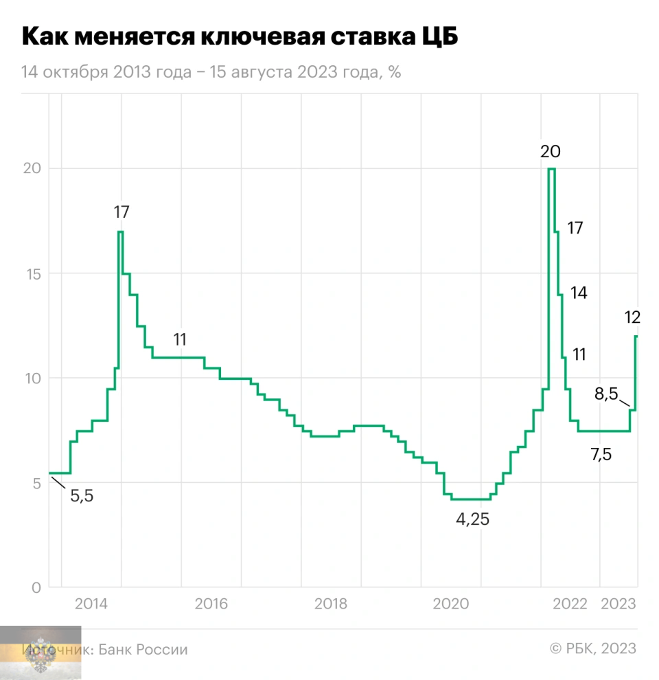 На данный момент график повышения ключевой ставки выглядит так. Пиковые значения в 17%, 20% – это известные кризисы.