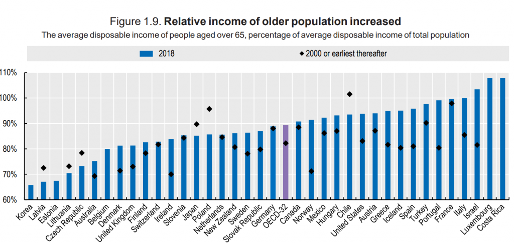 На графике вы видите доходы пожилых людей в процентах от среднего дохода населения.
