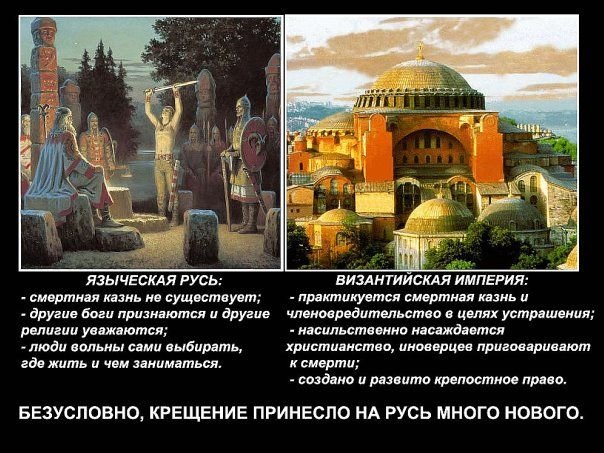 Всё это, как отработанный механизм, применялось для христианизации европейских стран, и Русь не была исключением. Как же всё произошло на Руси? Ведь, Русь имела свою богатейшую культуру, собственную религию в двух формах: Инглиизм и Ведизм. Особую форму государственности – Вечевую демократическую республику. Каждый человек был свободным и не знал, что такое рабство, предательство, ложь и лицемерие. Славяне с уважением относились к верам других народов, ибо соблюдали Заповедь Сварога: «Не навязывайте Святую Веру насильно людям и помните, что выбор веры – личное дело каждого свободного человека».