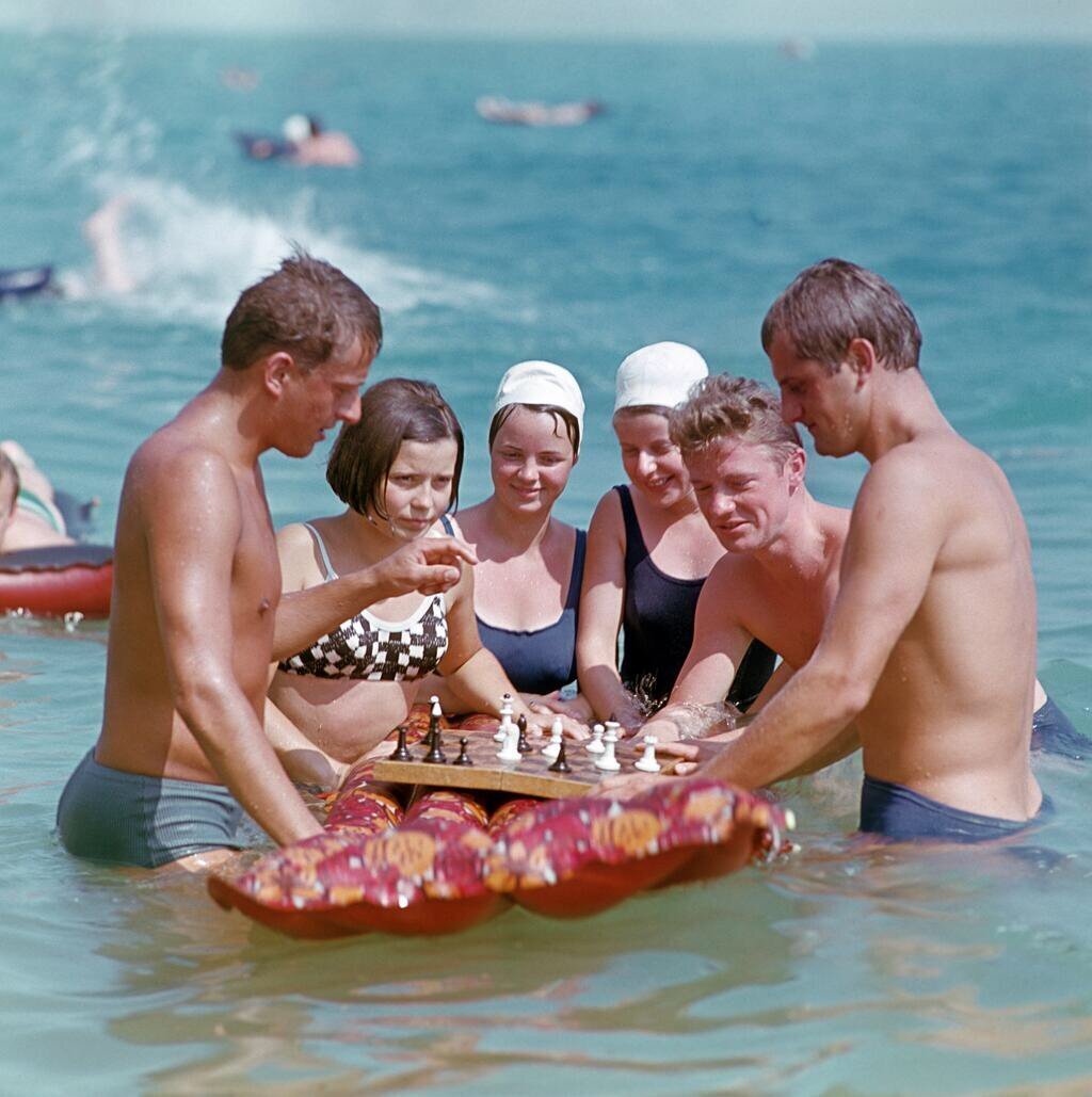 Отдых в СССР. Крайний слева, с приподнятой чуть рукой (задумал хитрый ход в шахматах), мой дядя с друзьями и подругами. Алушта 1972 год.