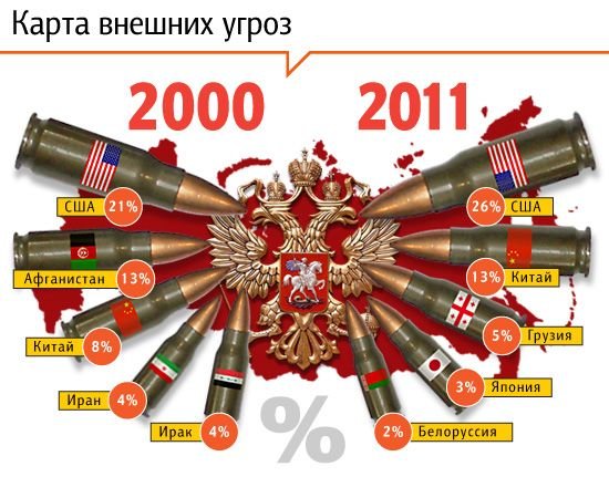Самым главным врагом россияне по-прежнему считают Америку. США заняли первое место с 26% голосов. На втором месте в списке внешних угроз оказался Китай, которого посчитали геополитическим соперником 13% россиян. Замыкает тройку Грузия - 5% опрошенных. Четвертое место с 3% досталось Японии. А на пятое место попала Беларусь: страной-врагом ее обозначили 2% респондентов.