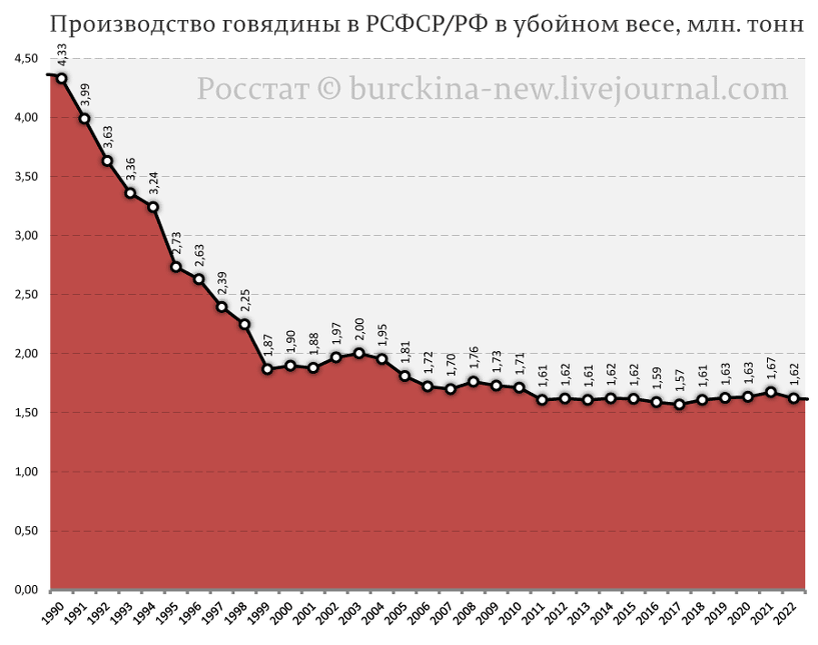 Так или иначе история вышла резонансная из-за того, что утверждения Владимир Владимировича НИкак НЕ соотносились НИ с воспоминаниями людей, НИ со статистикой того же Росстата, согласно которой нынешняя России производит говядины, из-за которой поднялся весь сыр-бор, примерно в три раза меньше, чем РСФСР в 1990-м году: