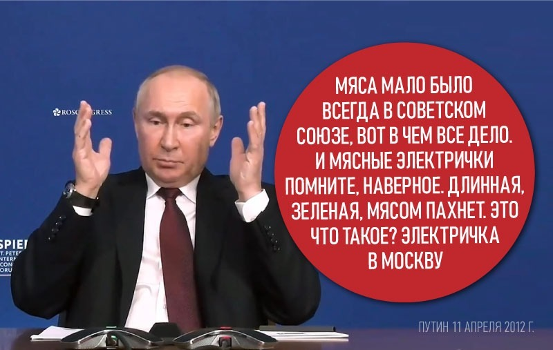"Я говорю правду! Правду! И вы должны знать об этом, если занимаетесь этим вопросом", - практически переходя на крик, заявил Путин. "В России, в Советском Союзе НЕ было специального мясного животноводства", - продолжал настойчиво апеллировать к истории глава правительства.