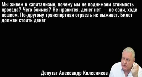 «Мы живем в капитализме, почему мы НЕ поднимаем стоимость проезда? Чего боимся? НЕ нравится, денег НЕТ — НЕ езди, ходи пешком. По-другому транспортная отрасль НЕ выживет. Билет должен стоить денег», — приводит слова депутата 66.ру. В сети заявление вызвало возмущение.