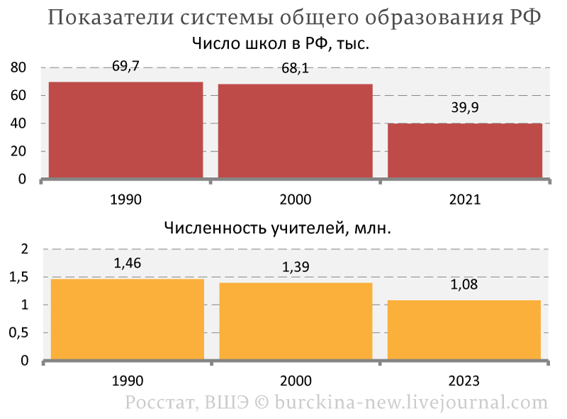 Вот краткая суть рассказанного: учителя находятся в перманентном стрессе, дефицит кадров составляет 250 тысяч (и это расчёт только в вакансиях), колоссальный отток, из-за чего оставшиеся трудятся за троих, преподавание НЕ по профилю, когда, например, географы преподают иностранный язык и даже музыку, продолжающиеся закрытия школ и т.д.