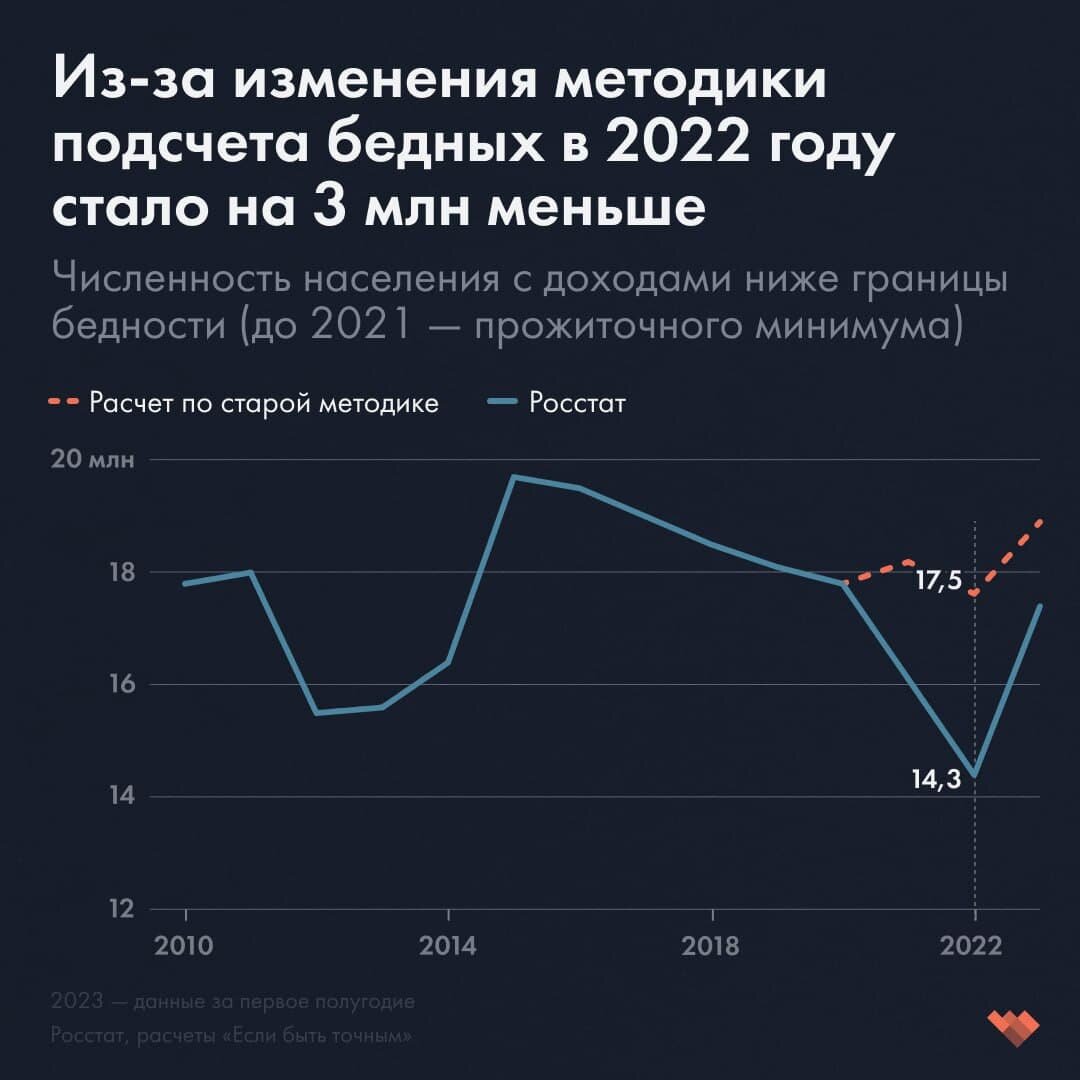 Но если бы уровень бедности рассчитывали по-старому, в 2022 году к бедным причислялись бы НЕ 14,3 млн, а около 17,5 млн россиян.