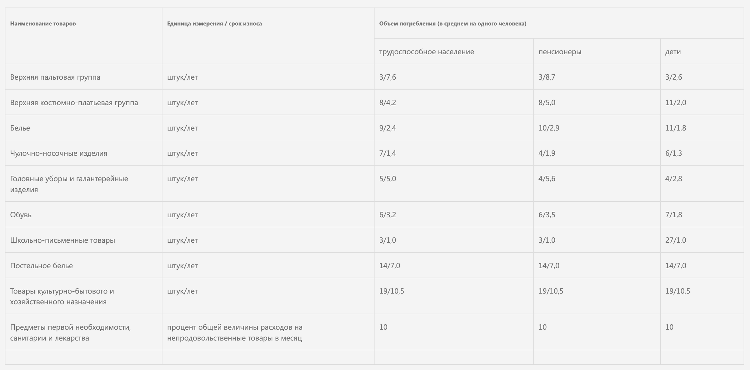 Я собирал данные о содержимом потребительской корзины пенсионера, но на скриншотах из документа, опубликованного на портале Минтруда, вы узнаете и о других категориях населения — трудоспособных гражданах и детях.