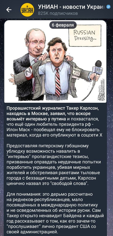 Для вас Карлсон - яркий, и его визит в Москву - важное событие. А в США большинство СМИ (телеканалов и газет) об этом визите даже не упомянули. Статья в CBS NEWS "Tucker Carlson to interview Vladimir Putin in Moscow" появилась вчера, но не привлекла к себя никакого интереса: всего 7 американцев оставили там свои комментарии. Россиянам нужно понять, что рядовых американцев не интересует ни Украина, о которой большинство американцев никогда не слыхало, ни по большому счёту Россия.