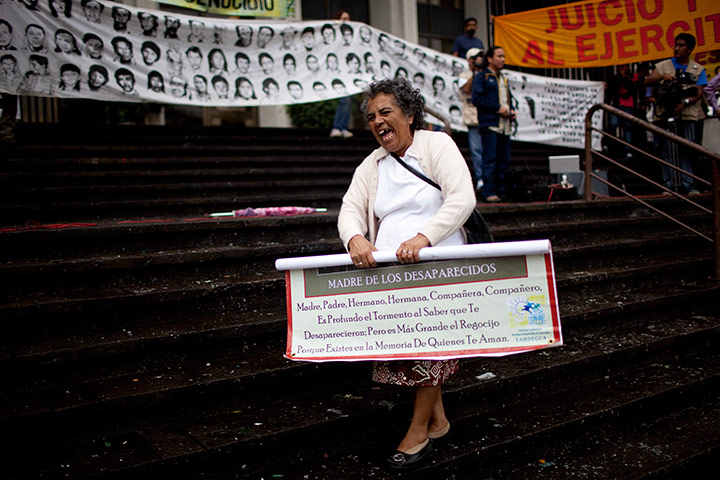 Гватемала Сити, Гватемала: женщина возле суда радуется тому, что четыре местных военнослужащих признаны виновными в массовой расправе над жителями деревни Лас Дос Эррес в декабре 1982 года. Каждый из них в итоге приговорен к 6 тысячам годам и 60 дням тюрьмы. против правительства
