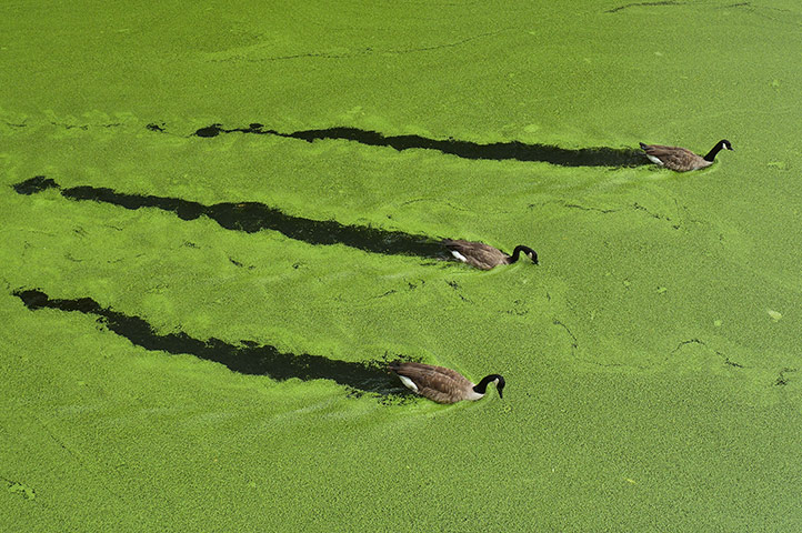 Лондон, Великобритания: гуси плывут через водоросли на канале Регента в Камден