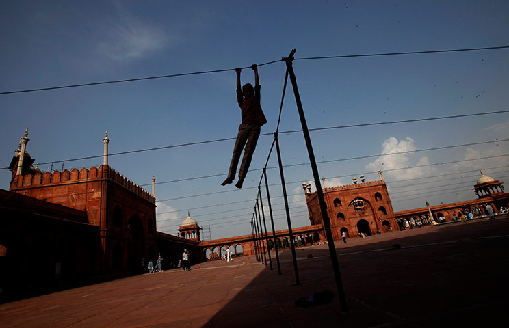 ели, Индия: мальчик висит на проволоке в мечети Джама Масджид