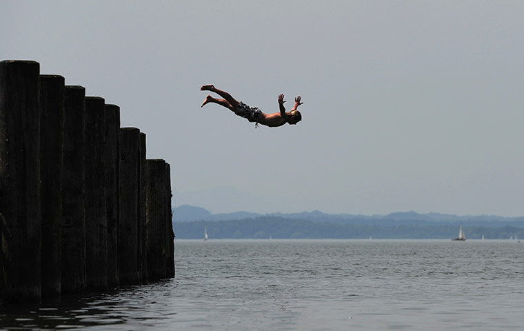 Gstadt, Германия: молодой мужчина прыгает в воды озера Кимзее с Альп