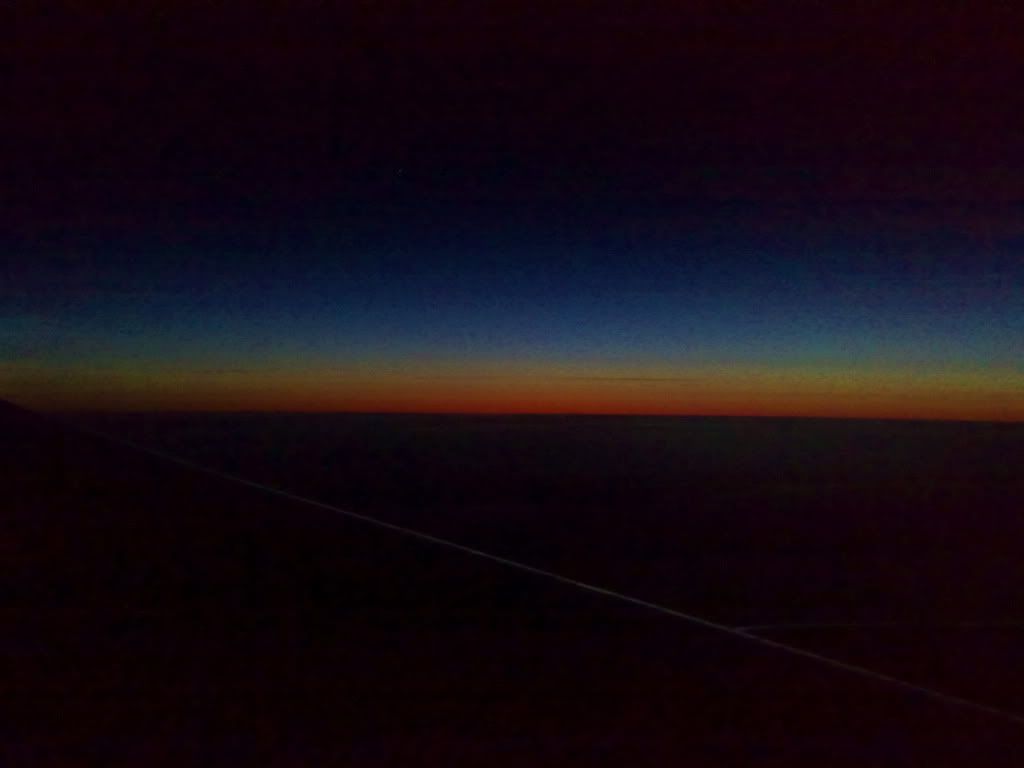 Рассвет под крылом самолета.