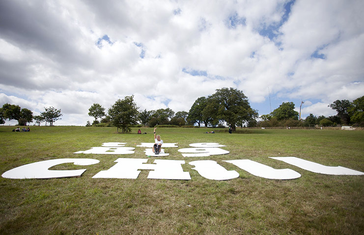Посетитель музыкального фестиваля Big Chill машет приветливо рукой в графстве Херефордшир