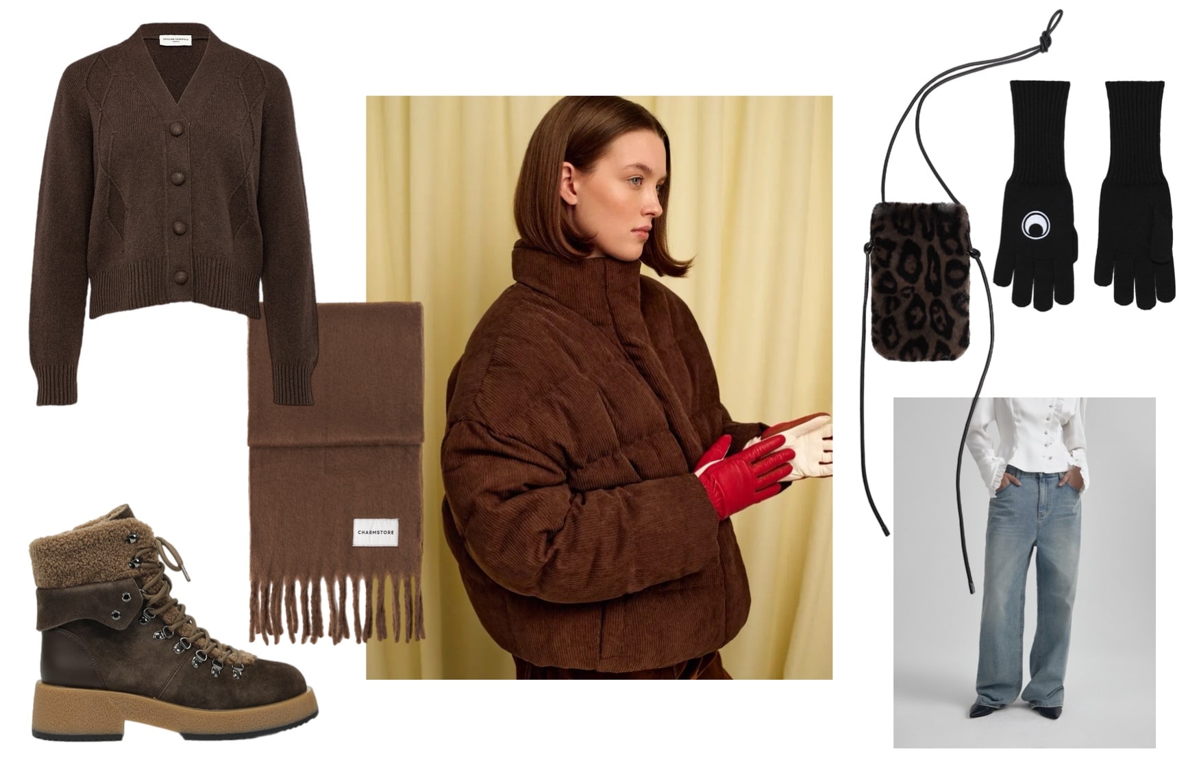 Еще один вариант — трендовый вельветовый пуховик, широкие джинсы, шерстяной кардиган и зимние хайкеры из натурального велюра. Все в одной гамме. Вместо громоздкой сумки — сумка-чехол для смартфона на длинном шнурке. Не забываем про теплые аксессуары: перчатки и объемный шарф.