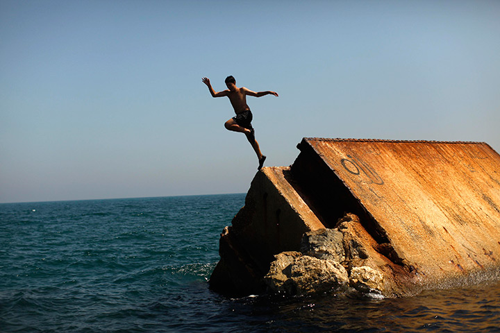 Малага, Испания: парень прыгает в Средиземное море в жаркий летний день