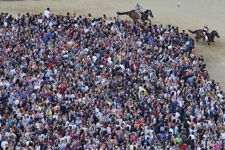 Сиена, Италия: Тысячи туристов собрались посмотреть на состязания всадников без седла на площади Ил-Кампо