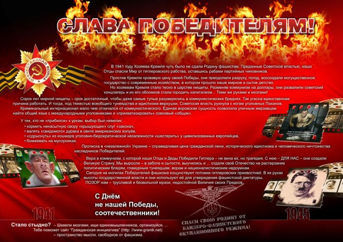 Сегодня потомки и фашистов, и антифашистов живут в одной стране. Но такое сосуществование не повод для кощунственного сравнения, а тем более уравнивания военных заслуг тех, кто воевал ЗА фашистов и ПРОТИВ них. Хотя бы потому, что если бы победили немецкие фашисты, то у их украинских холуёв, которых даже гитлеровцы считали недочеловеками, физически бы не осталось потомства – Хозяин бы не позволил. А ещё потому, что именно благодаря победе антифашистов в той войне, уцелел заповедник чиновной мрази по имени «Советская власть», чьи выкормыши сегодня, заняв кабинеты кондовых коммунистов, способствуют возрождению фашизма в Украине на государственном уровне.