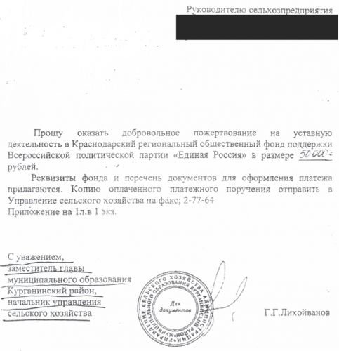 В распоряжении «Новой газеты» оказался любопытный документ: администрация Курганинского района Кубани предлагает директорам предприятий заплатить. Судя по письму, его подписал зам. главы района Геннадий Лихойванов. В письме предлагается «оказать добровольное пожертвование на уставную деятельность в Краснодарский региональный общественный фонд поддержки Всероссийской политической партии «Единая Россия». Ручкой вписана требуемая сумма, 50 тысяч рублей.