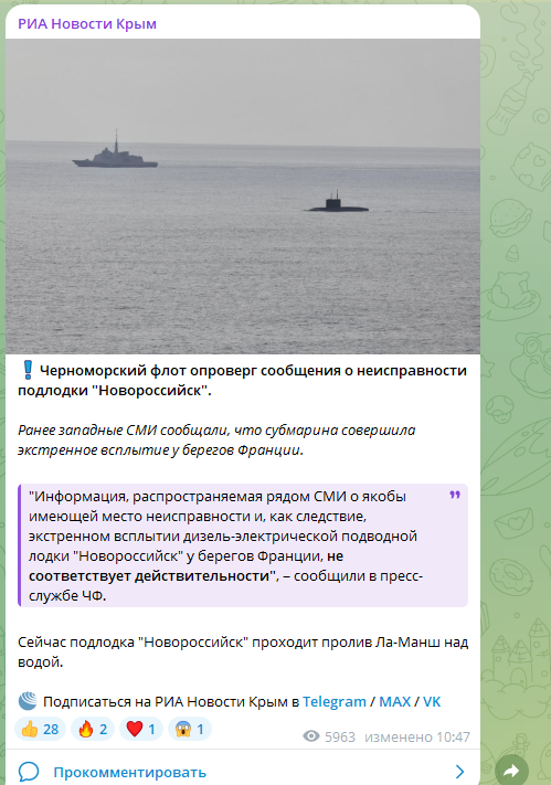 Информация, распространяемая рядом СМИ о якобы имеющей место неисправности и, как следствие, экстренном всплытии дизель-электрической подводной лодки "Новороссийск" у берегов Франции, не соответствует действительности.