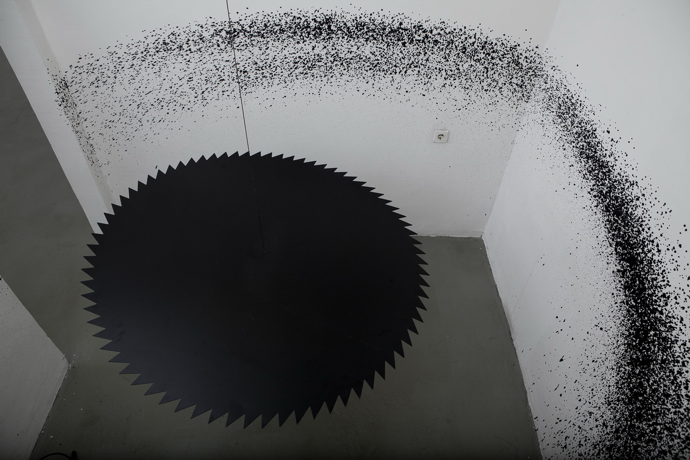 Она представляет собой зависшие в воздухе дисковые пилы, от которых отлетают капли черной краски. Если смотреть на пространства цеха в целом, можно даже подумать, будто эти острые предметы и нанесли рану Христу.