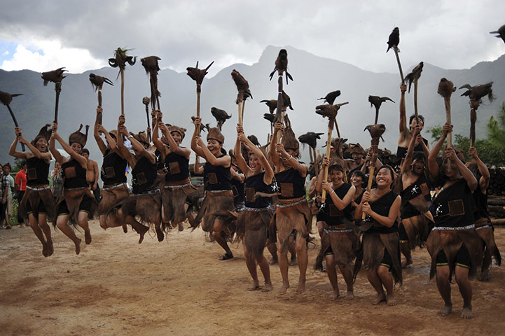 Zhenxing, Китай: Жители выполняют народный танец во время посещения туристов. Деревенщина считает, что танец может отогнать злых духов и приносит удачу