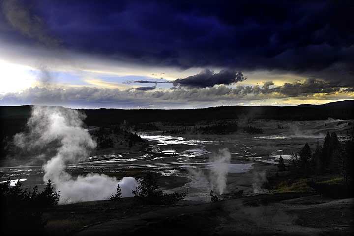 Йеллоустонский национальный парк, Вайоминг: гейзер бьет в лучах заката.