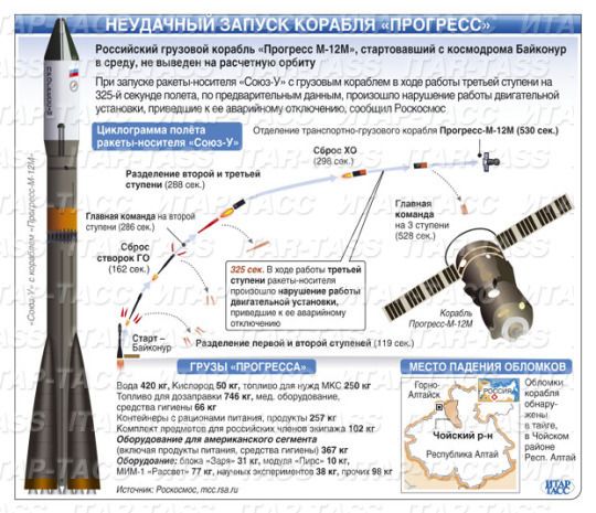 Сегодня грузовой космический корабль «Прогресс М-12М», запущенный с космодрома «Байконур», не сумел выйти на расчётную орбиту. Этот инцидент стал уже вторым случаем неудачного запуска космического аппарата в России.Очередная космическая авария