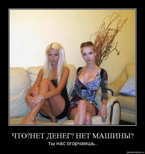 — Не, ну вы представляете, я всего-то у него штуку баксов прошу в месяц, а он сказал — не даст! Я убираться не умею, готовить ни фига не умею. Мне теперь что, голодной и в грязи сидеть? А он: «Иди работай!» Я — работать? Это вообще как, нормально? Говорит, у тебя все подруги работают. Да кто работает? Ты работаешь? Нет! Он мне предложил: «Давай я тебе магазин куплю». Не, ну прикиньте, это мне надо будет каждый день вставать, ехать туда, что-то там делать! Оно мне надо? Всё, выйду замуж за олигарха — не будет мне указывать!
