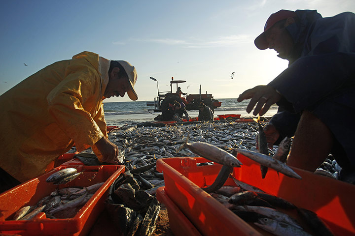 Капарика, Португалия: рыбаки фасуют улов по ящикам.