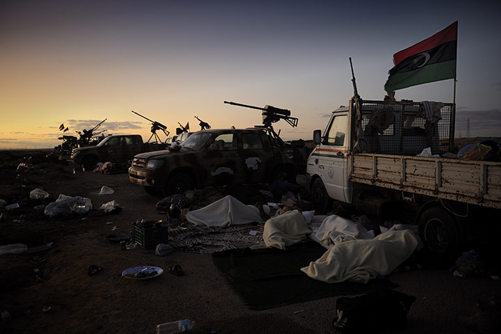 Noflia, Ливия: солнце встает над спящими боевиками расположившимся на линии фронта. Повстанческие отряды переходят в последнее наступление, армия Каддафи отступает.