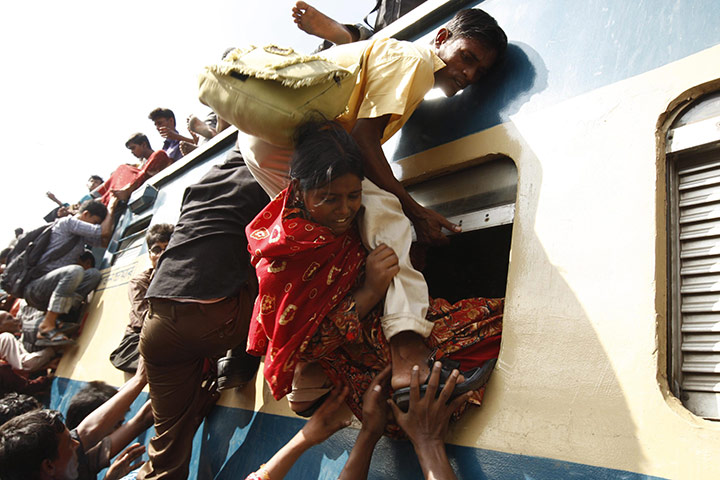 Дакка, Бангладеш: люди отчаянно пытаются попасть домой в свои деревни, цепляясь за любые выступающие части поезда.