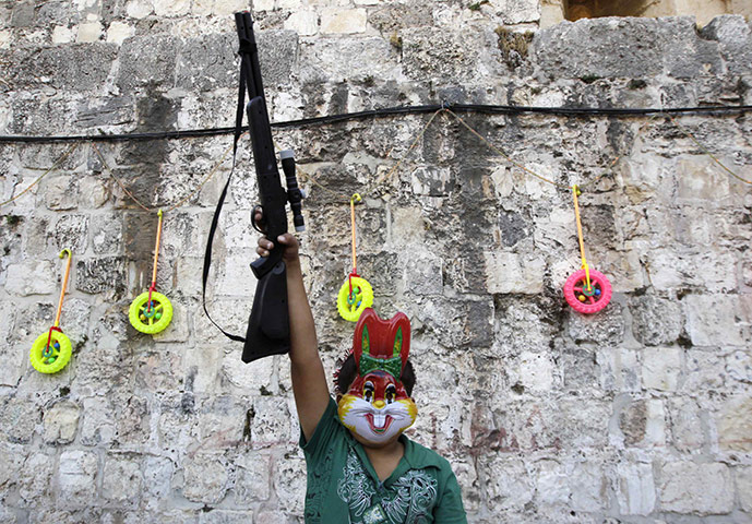 Иерусалим: прохожий палестинец в маске демонстрирует винтовку в первый день Ураза-байрам.