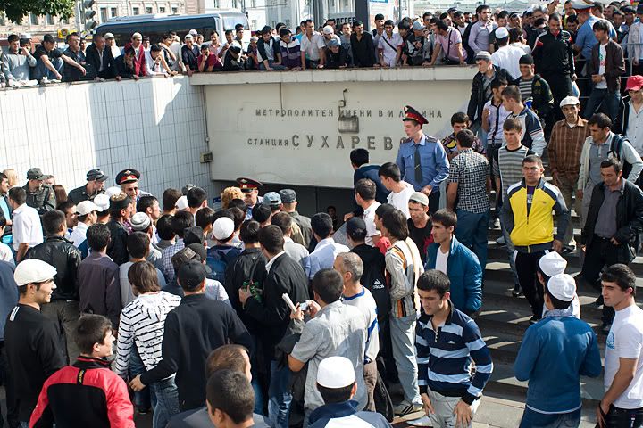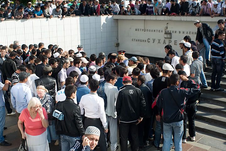 2. когда я уже подошёл к метро сухаревская (на станцию проспект мира проход был закрыт), то увидел перед ней толпу людей. я предполагал, что после окончания молитвы, все хлынут в ближайшие станции, но милиция решила сразу всех не пускать, чтобы не создавать давку внизу.