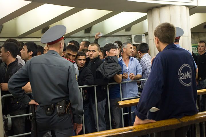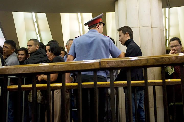 5. но и там вход был перекрыт. наверх людей, естественно, выпускали. вниз тоже можно было пройти... пропускали москвичей. точнее белых... людей арийской расы... россиян. в общем, не гастарбайтеров.