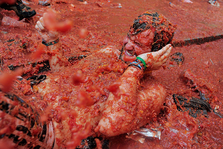 Буньоль, Испания: участник ежегодного фестиваля Помидорина купается в томатном соке.