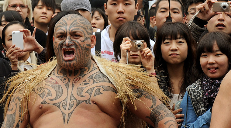 А это новозеландский болельщик в окружении японских в преддверии чемпионата мира по регби.