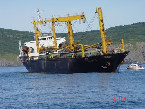 Так, ранним утром 2 сентября камбоджийский сухогруз «Айкишун» с грузом стройматериалов на борту умудрился при хорошей погоде и нормальной видимости сесть на мель аккурат на входе в Авачинскую губу. Он получил небольшую пробоину, но, слава Богу, не в районе танков и особо не повлиявшую на его непотопляемость. То есть, в почти что целом виде насадился на банку, коих в изобилии находится вблизи подходного канала в порт Петропавловск-Камчатский. Погода была хорошая, так что экипажу ничего не угрожало, и его благополучно сняли на берег.