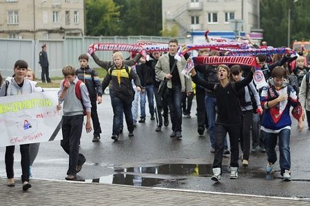 Вот идет колонна школьников с шарфами и футболками. Они хором кричат: «Там, где «Локо» - там победа!». Издалека может показаться, что идут они не на поминки, а на обычный матч. Ребята подходят ближе, слова меняются: «Любим, помним, скорбим!» Интонация – все та же, как на трибунах. Не слишком ли весело они скорбят? – задумались, у девушек на глазах появились слезы, у некоторых мальчишек тоже. Говорят, что «таким образом поддерживают любимую команду» - хотя как можно поддержать мертвых со вчерашнего дня людей, никто не понимает. К ребятам подходит еще один человек в штатском, увещевает их не шуметь: «вы же пришли на траур!». Школьники – это вся 9 параллель одной из ярославских школ – неожиданно легко затихают и дисциплинированно идут к стене плача с цветочками.