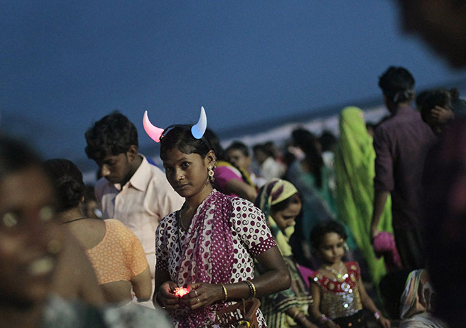 Женщина со светящимися рогами дьявола бродит по пляжу в Мумбаи, Индия.