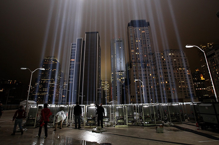 Нью-Йорк, США: рабочие корректируют пучки света на мемориале, посвященном жертвам террористической атаке 11 сентября.