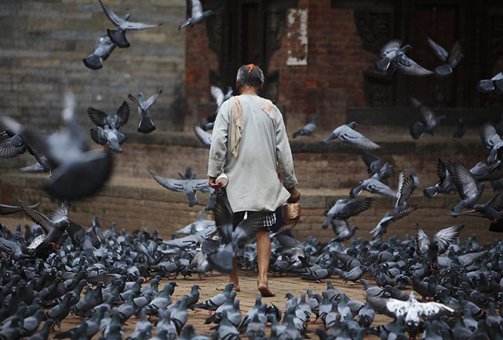 Катманду, Непал: человек проходит мимо голубей внутрь храмового комплекса, чтобы помолиться.